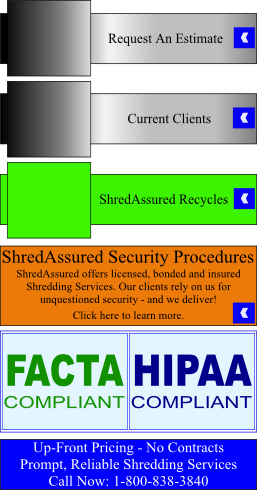 Please click here for more information, or give us a call at 1-800-838-3840 to find out how ShredAssured can help your company save money, protect its information, and comply with federal and state laws. Our client specialists are ready to assist and willing to help in any way they can.